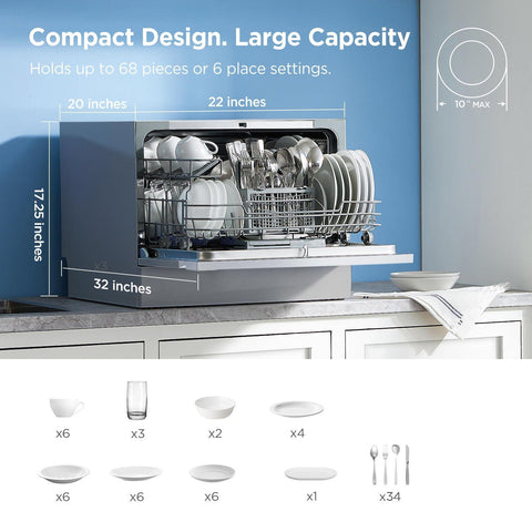- 6 Place Setting- A perfect size (H17.25″×W22″×D20″) for 2-3 people. Midea compact dishwasher is suitable for dorms, RVs, and apartments. This countertop dishwasher can fit up to 70 pieces of tableware and has a plate size of up to 10 inches in diameter. Note: Midea dishwashers are tested at the factory before they are shipped. If your new dishwasher has some water inside, this is normal.