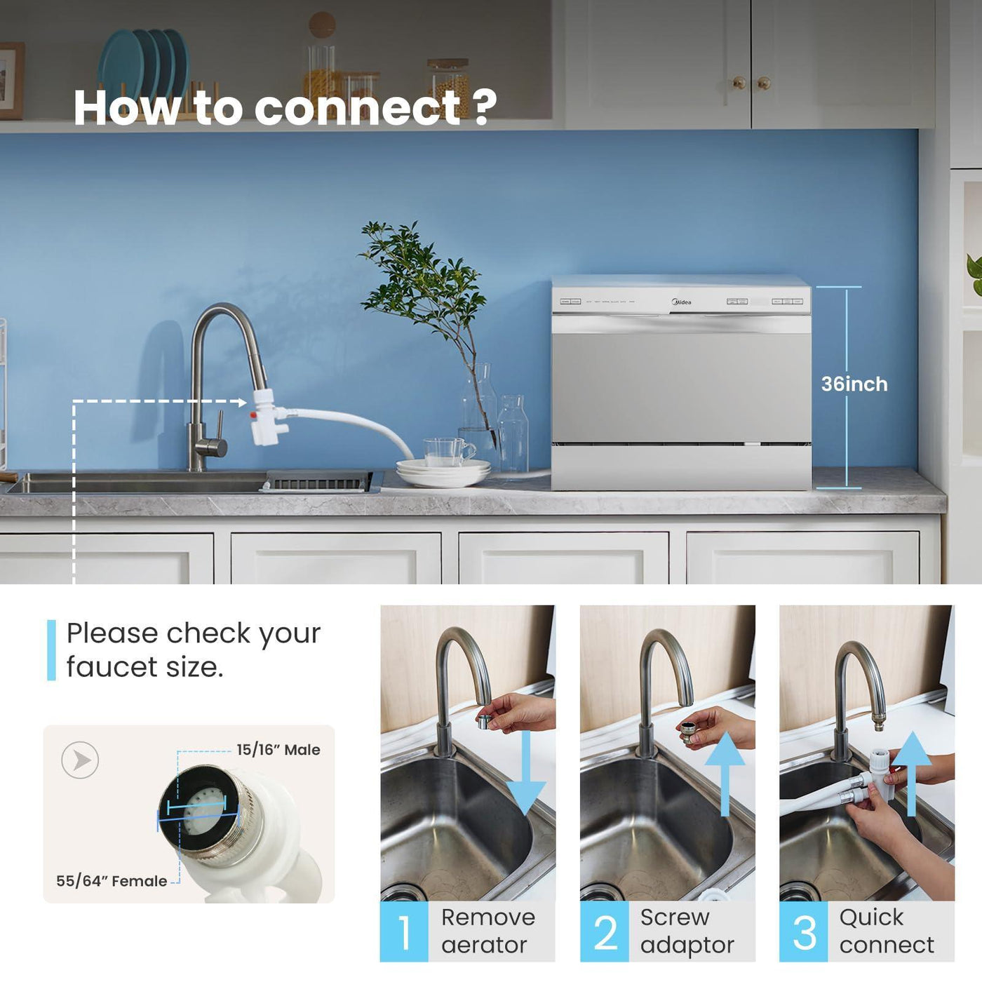- Simple Installation- Midea portable dishwasher can be connected to faucet directly (Suitable adaptor needed). Depending on your needs, it can be flexibly placed on the table or fitted in the cupboard.