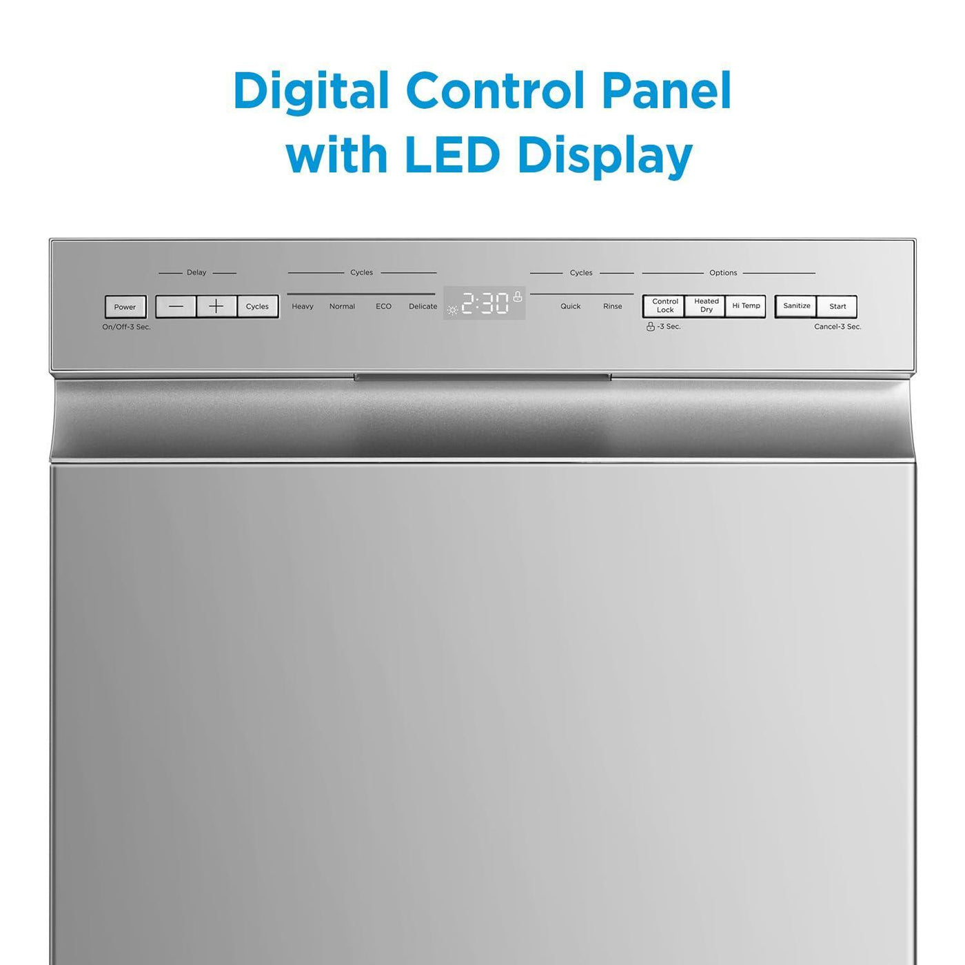 - 6 programs+3 functions : The 18-inch dishwasher offers six programs, including Heavy, Normal, ECO, Delicate, Quick, and Rinse washing programs. It also features Heated Dry, Hi-Temp, and Sanitize functions that meet all your daily needs. Note: ONLY use detergent specially for dishwasher because regular liquid dish soap will cause dishwasher problems.