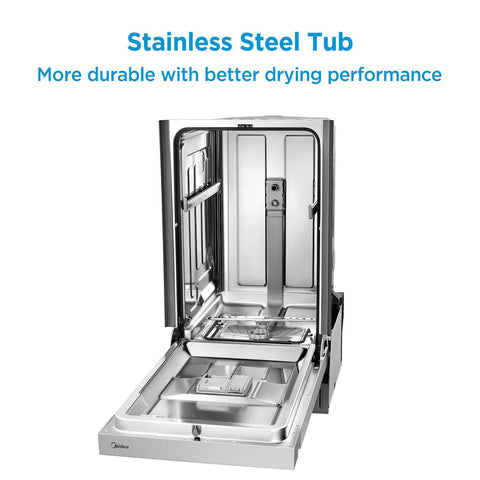 - Slimline Design with Large Capacity : The Midea built-in dishwasher boasts a slim body that takes up minimal space and is easy to fit. It features a digital control panel with an LED display and has been thoughtfully designed to accommodate larger plates, pots, and pans up to 11 inches in height.
