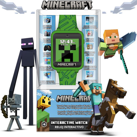 - Interactive Minecraft watch with touchscreen display and 10 customizable watch faces featuring Creeper, Enderman, TNT, and more