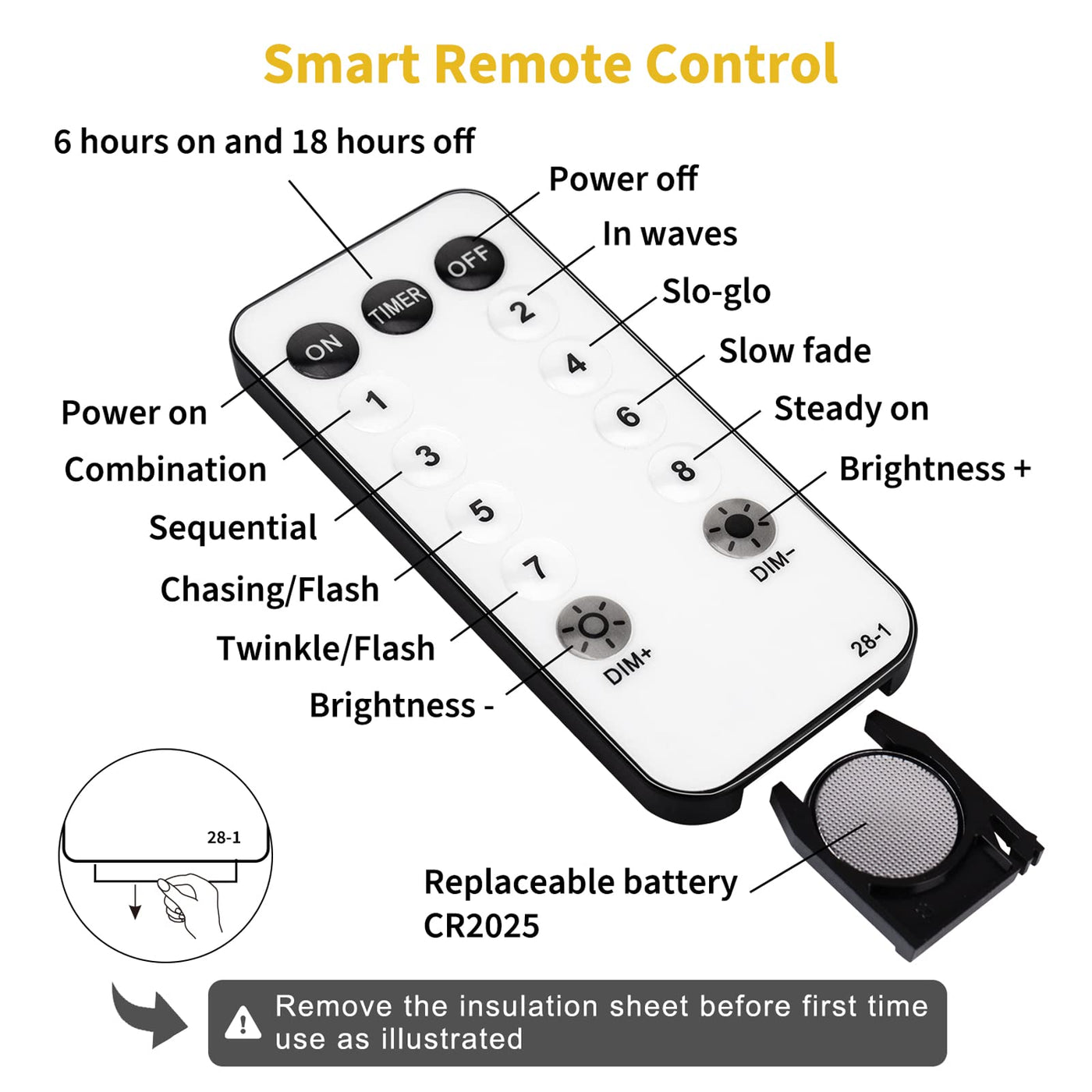 - Timer Functions and 8 Mode Lights: The rv globe lights have 8 lighting modes, namely combination, in waves, sequential, slo-glo, chasing or flash, slow fade, twinkle and flash, and steady on. The rv outdoor lights also have a memory function allowing you to set your specific mode and use the timer function on the remote to turn on the lights for 6 hours and off for 18 hours automatically every day.