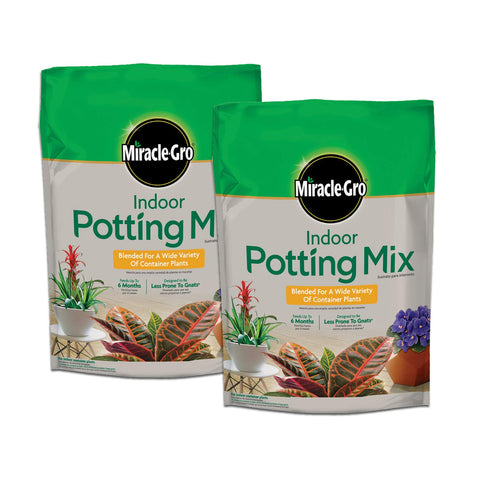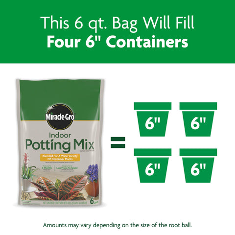 - What's included: This bundles includes two 6 qt. bags of Miracle-Gro Indoor Potting Mix, each able to fill four 6-inch containers (exact amount may vary based on the root ball size)
