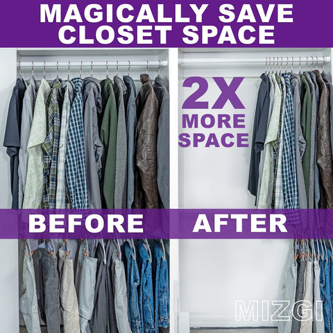 - MAXIMIZE CLOSET SPACE - Designed MIZGI hangers Increases Closet space by as much as 50 percent.The slim and sleek design efficiently works, maximizing space and adding class, helping you organize your wardrobe in the most space efficient manner
