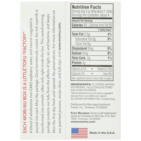 Details: Mori-Nu - Silken Tofu - Soft Mori-Nu - Silken Tofu Soft - 12 oz. (340 g) Mori-Nu Soft Silken Tofu is great to use for smoothies, dips and sauces. Low-fat, heart-healthy vegetable protein for dips, sauces & smoothies. Great alternative to eggs and dairy. Needs no refrigeration until opened. Mori-Nu's Tofu Good Source of protein Made with Non-GMO Soy Cream, silken texture Low-fat Dairy-free/Vegan
