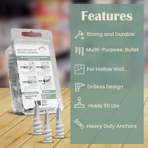 - 👍No Drill? No Problem. Easy Install in Minutes: These self-drilling drywall anchors with screws are perfect for fast installs. Just press, twist, and drive—no pre-drilling needed. Whether you're using a manual screwdriver or power tool, you’ll get a clean, flush fit without damaging your walls. Great for renters, DIYers, or pros working with dry wall anchor setups.