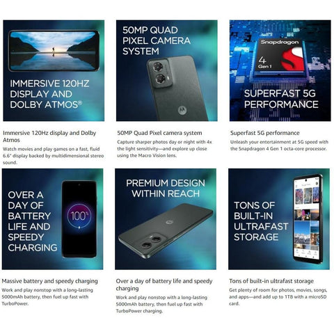 Details: The Moto G 5G (2024) is an affordable smartphone that offers a 6.6-inch LCD display with a 120Hz refresh rate, providing smooth visuals. Powered by a Snapdragon 4 Gen 1 processor, it includes 4GB of RAM and 128GB of storage, expandable via microSD. The device features a 50MP main camera and a 2MP macro lens, along with an 8MP front-facing camera. Its 5,000 mAh battery ensures extended usage, and the vegan leather back adds a touch of style.