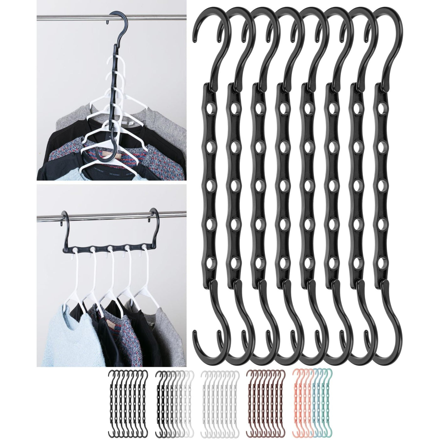 - Package includes 8 space-saving hangers in black color. You can store multiple garments on a single magic hanger rack, keeping clothes organized and wrinkle-free.