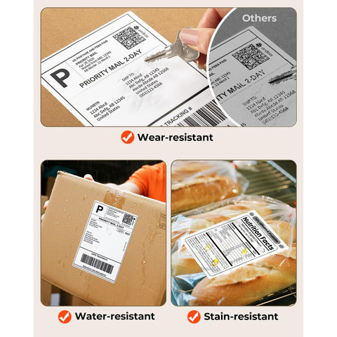 - Upgraded Materials: Thermal labels 4x6 improved to deliver crystal-clear images, easy-to-read barcodes, enhanced brightness, and resistance to smudges and scratches