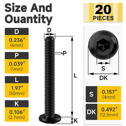 - SIZE: Thread Diameter: 6mm; Screw Length: 50mm; Thread Pitch: 1mm; Head Diameter: 12.7mm, Head Height: 2.8mm, Hex Drive Size: 4mm. Ideal for furniture assembly and outdoor use. (Not recommended for large machinery or structural use)