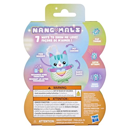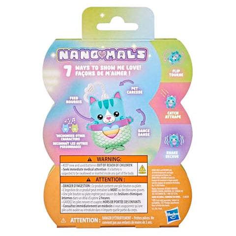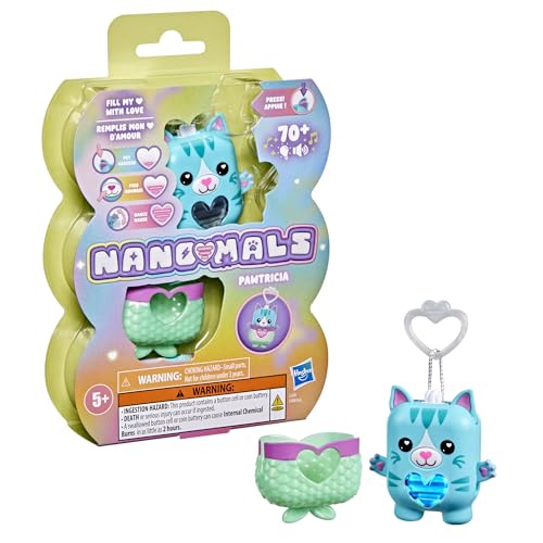 Details: Unlock a world of fidgety, fashionable pocket-sized pets with Nano-mals Pawtricia the blue kitty. Nano-mals are electronic fidget toys and adorable mini companions that need your love! Each Nano-mals character has a color-changing heart meter that kids can fill in so many fun and satisfying ways. When Pawtricia's heart meter drops, she'll make sounds to let you know she needs care. If her heart meter is blue, she needs pets, so press her ears. If her heart is orange, she's hungry -- press her mouth to pretend feed her. Is her heart pink? Click her arms up and down to make her dance. What about purple? She wants to move! Flip, catch, or shake to fill her heart. Pawtricia will celebrate her full heart with a song and colorful lights show. Give Pawtricia some extra flair with a textured snap-on mermaid outfit. Plus, she comes with an attached clip, so she makes a great kids keychain. Nano-mals are the perfect gift for kids who love animal toys, digital pets, and fidget toys. Nano-mals and Hasbro and all related trademarks and logos are trademarks of Hasbro, Inc.
