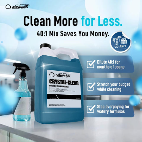 - ✅ HIGHLY CONCENTRATED VALUE: A small amount brings big results! With a potent 40:1 mix ratio with water, the CRYSTAL-CLEAR glass cleaner offers unmatched value for money. Its concentrated nature guarantees that your windows and surfaces remain impeccably clear, making each bottle last longer and work harder.