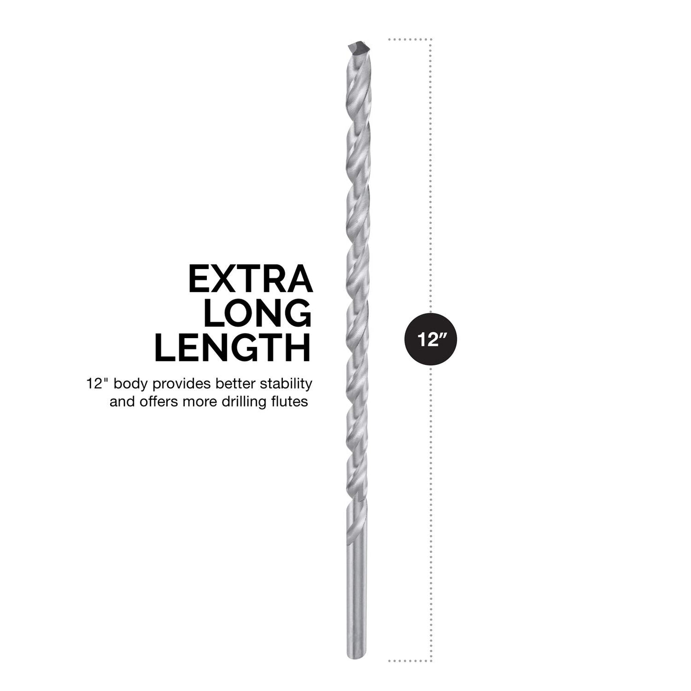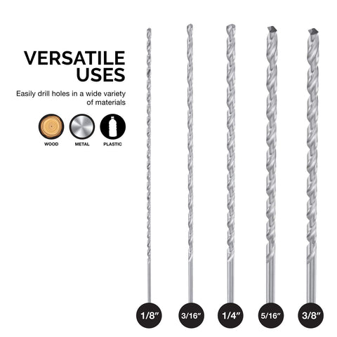NEIKO 10047A Extra Long Drill Bit Set | 5-Piece | M2 HSS Steel | 12-Inch Length | 1/8, 3/16, 1/4, 5/16, and 3/8-Inch
