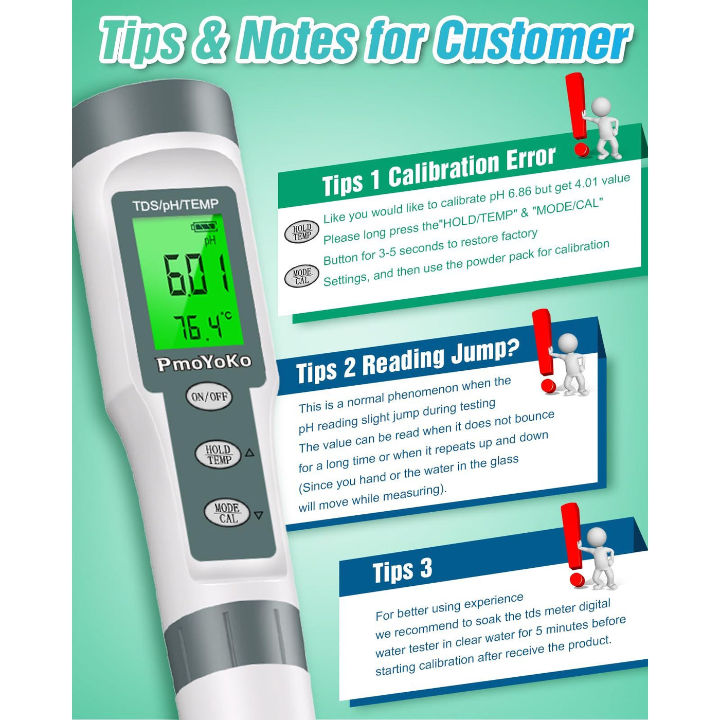 - 【Tips】 For better using experience, we recommend to soak the tds meter digital water tester in clear water for 5 minutes before starting calibration after receive the product. Because it may cause inaccurate readings if customer immediate use for the first time.
