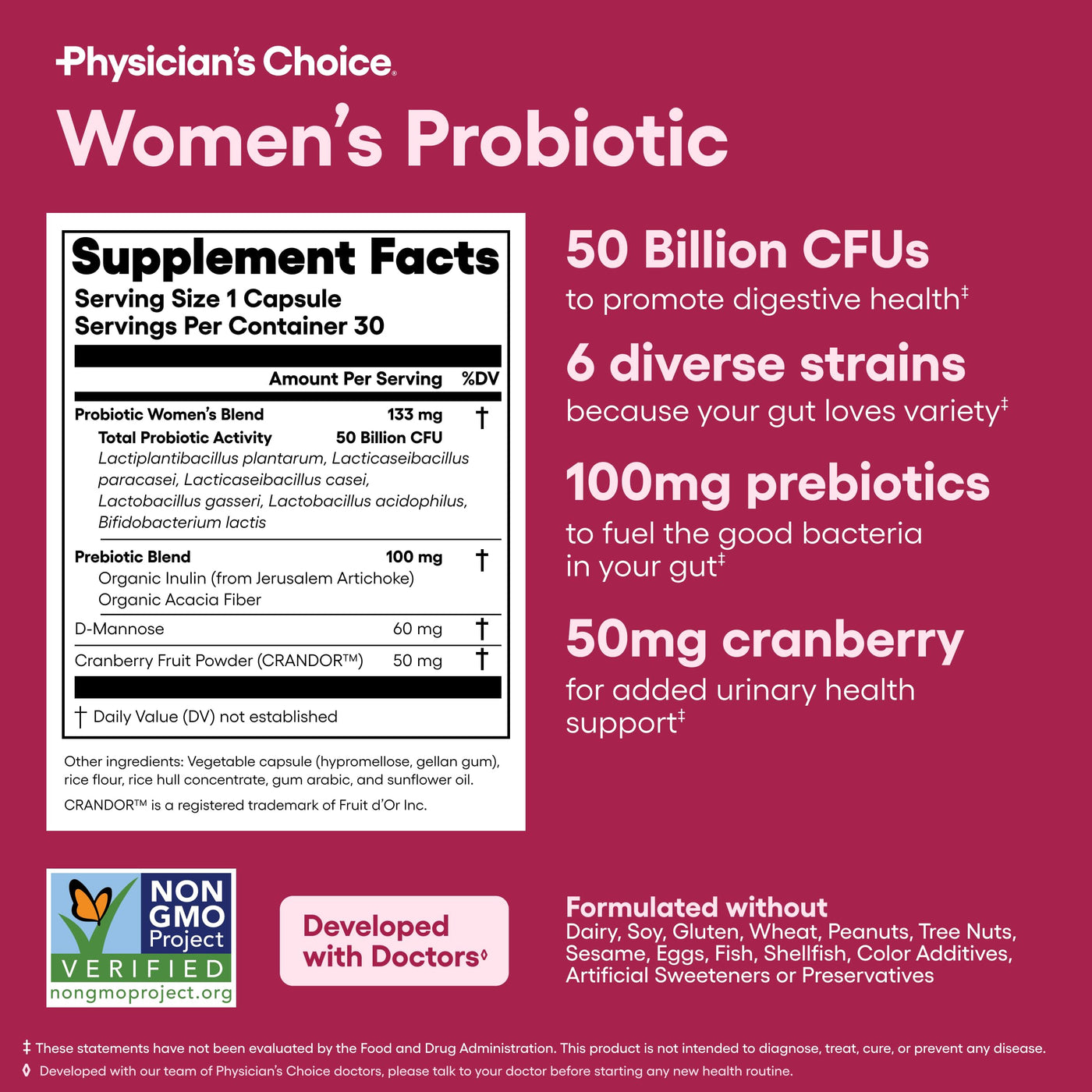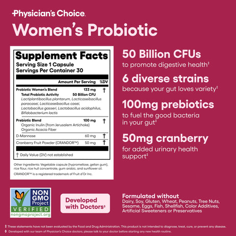 - Once Daily Probiotics for Women: Our probiotic is designed specifically for feminine health & overall digestive health. 6 diverse strains (50B CFU), D-Mannose, Pro-Cran, & organic prebiotics provide you with the feminine support you deserve. Same great product you love, with a new look. Packaging May Vary!