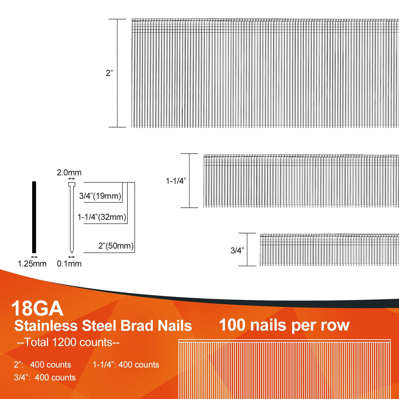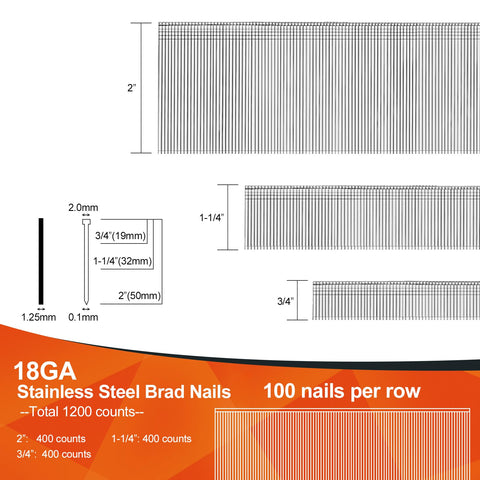 - 【WIDE SIZE VARIETY】- Comes total 1200-count stainless steel 18GA brad nails, including 3 different sizes of 2 inch, 1-1/4 inch and 3/4 inch. 400 Pcs of Each Size. These brads can accommodate a variety of materials from thin to thicker wood boards.