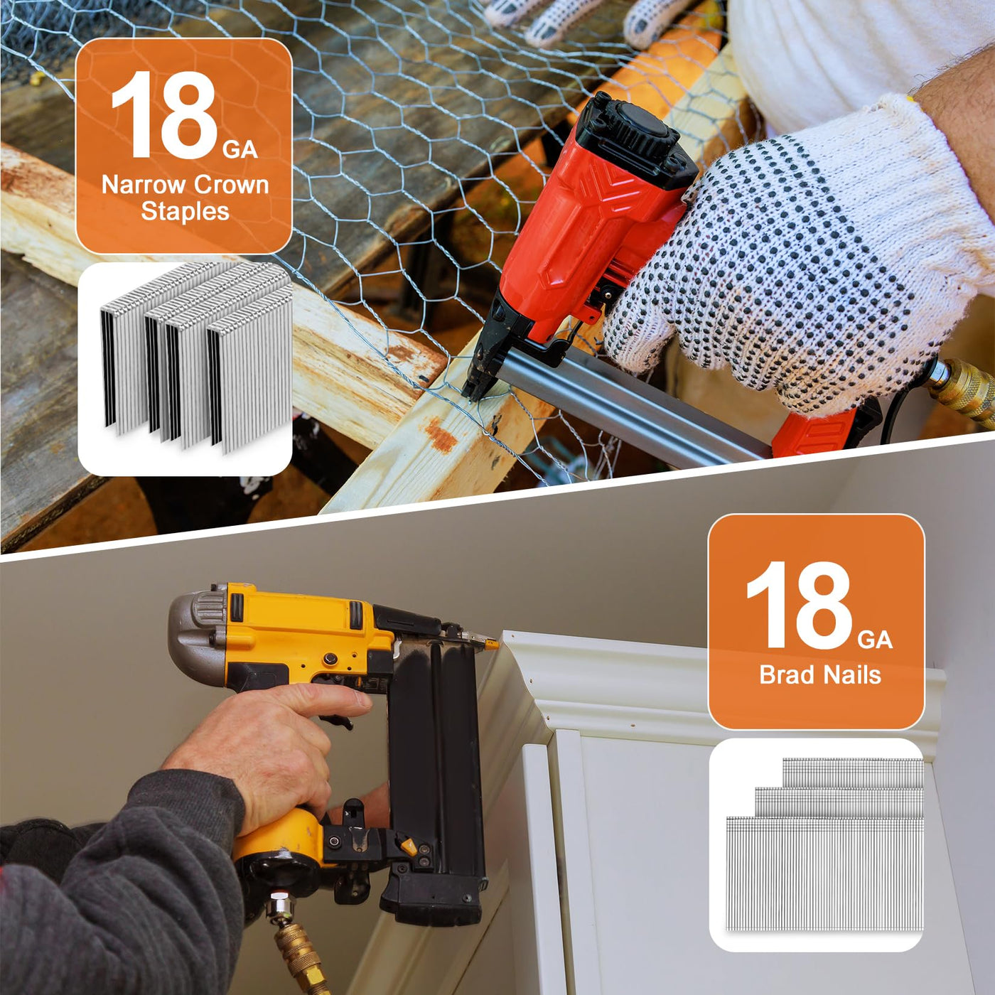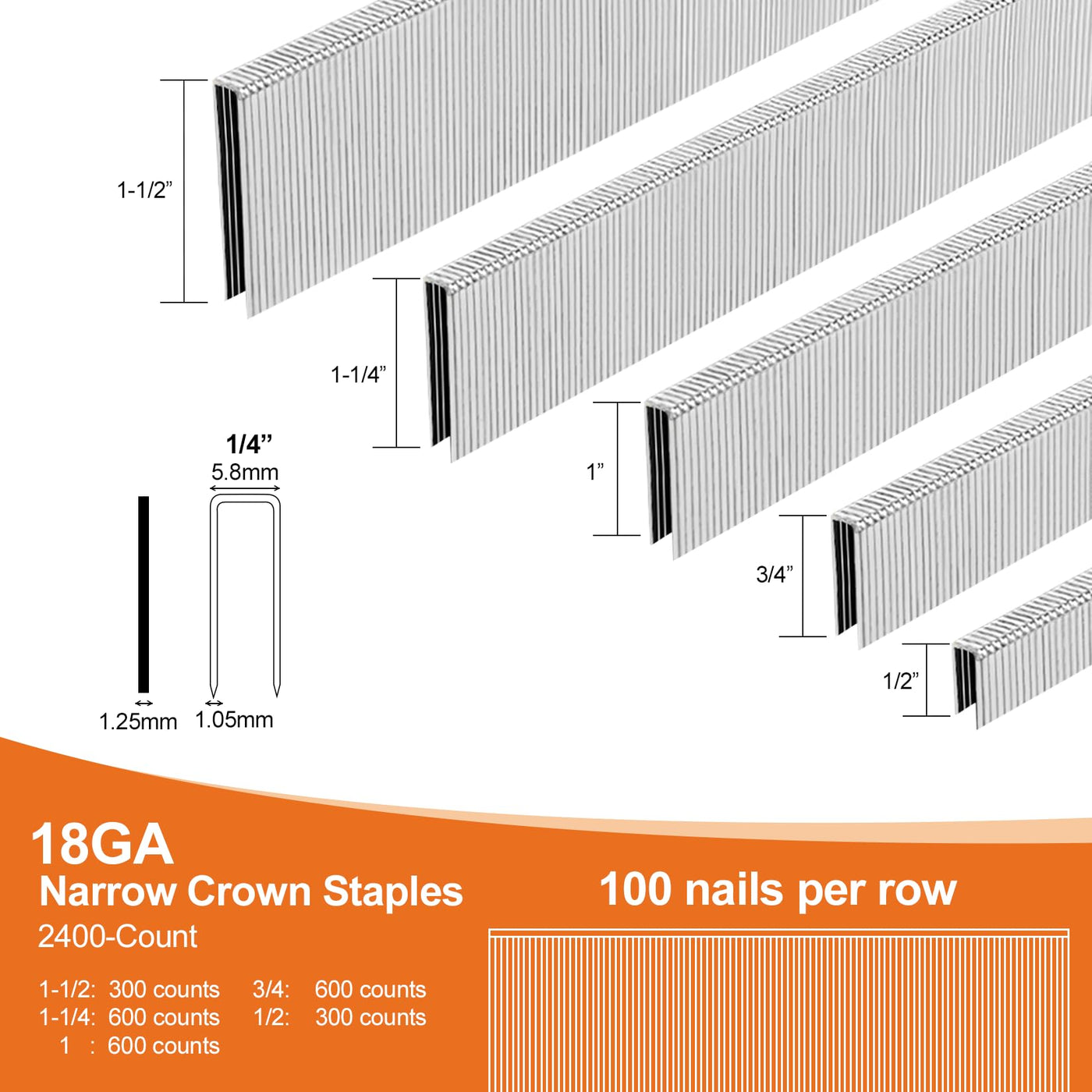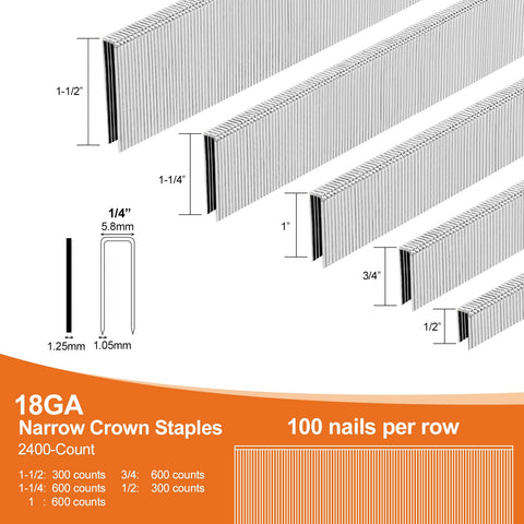- [What You Get] -- 18GA 1/4 Inch narrow crown staples 2400 counts and 18GA brad nails 1800 counts. Heavy duty multiple-size staple and nails assortment will meet most of your fastening needs;