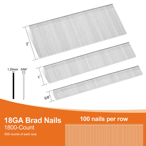 - [18 Gauge Brad Nails] -- Comes in three sizes 2", 1", 5/8" (600 count of each size);