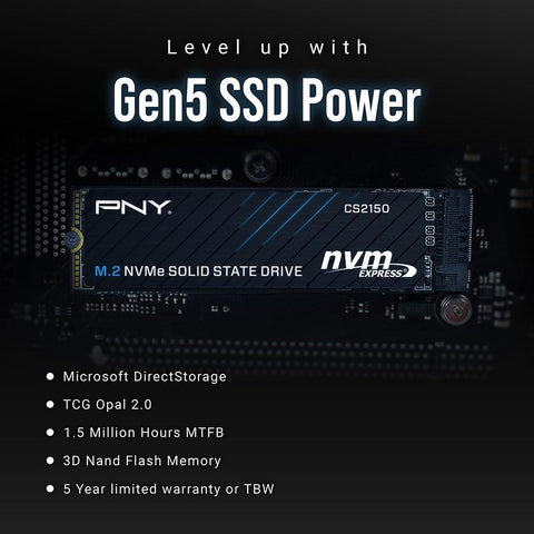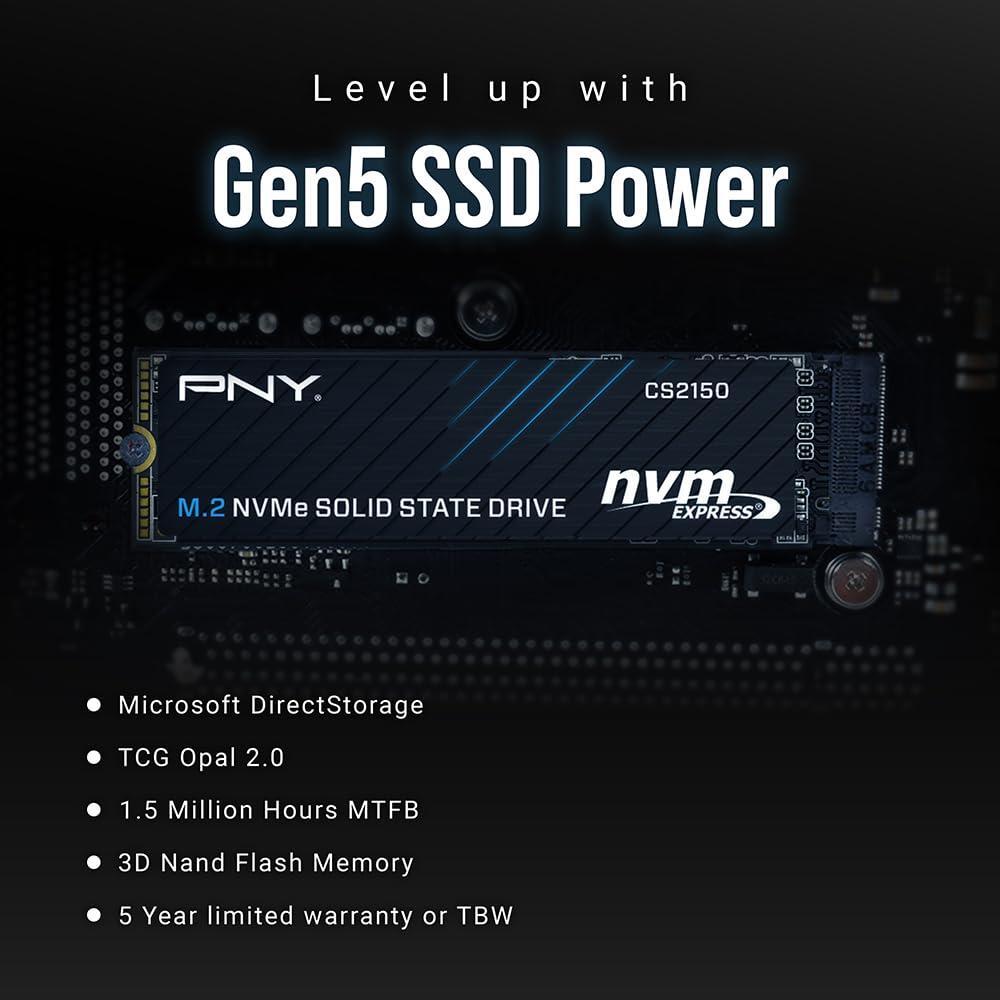 Details: The CS2150 M.2 NVMe Gen5 x4 Solid State Drive is designed to be an exceptionally high-performance SSD that delivers the transfer speed your desktop system deserves. It is the ideal solution for PC enthusiasts, gamers, and content creators to upgrade to the latest in NVMe technology. The NVMe interface delivers performance of up to 10,200 MB/s seq. read and 8,300 MB/s seq. write speeds. The PNY CS2150 is lightning-fast, reliable, and comes with a 5-year limited warranty or TBW.
