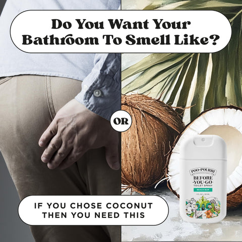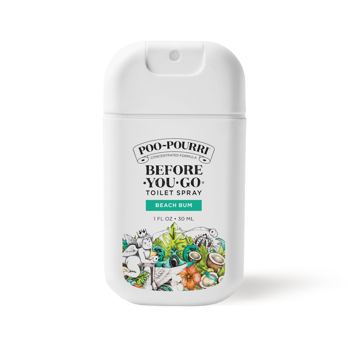 Details: Poo~Pourri Before-You-Go Toilet Spray, Beach Bum Whether you're hitting the road, heading to the office, or jet-setting off to paradise, the Poo~Pourri Beach Bum has your backside covered! This spray features a signature scent: Coconut, Orchid and Toasted Praline, in a 1 fl oz travel-sized bottle. Compact, but with big funk-fighting power, this plant-based spray use Funk Lock Technology to trap odors beneath the water's surface, before they escape into the air. That means no awkward exits, and no lingering funk. The only thing you smell is a fresh burst of essential oils. Designed with travel in mind, each bottle is made of durable plastic, delivers up to 50 uses, and fits in bags, purses, or pockets. Equipped with a sleek new sprayer, the nozzle is easy to press, delivering a fine mist and an even spray pattern. Spritz before you go and leave any bathroom smelling like a day at the beach, sipping a fruity cocktail from a coconut. Suitable for commuters, travelers, partygoers, or anyone on the go, this toilet freshener makes a thoughtful gift. So go ahead—use it before you go, wherever you go. Because everyone deserves to leave the bathroom smelling better than they found it.