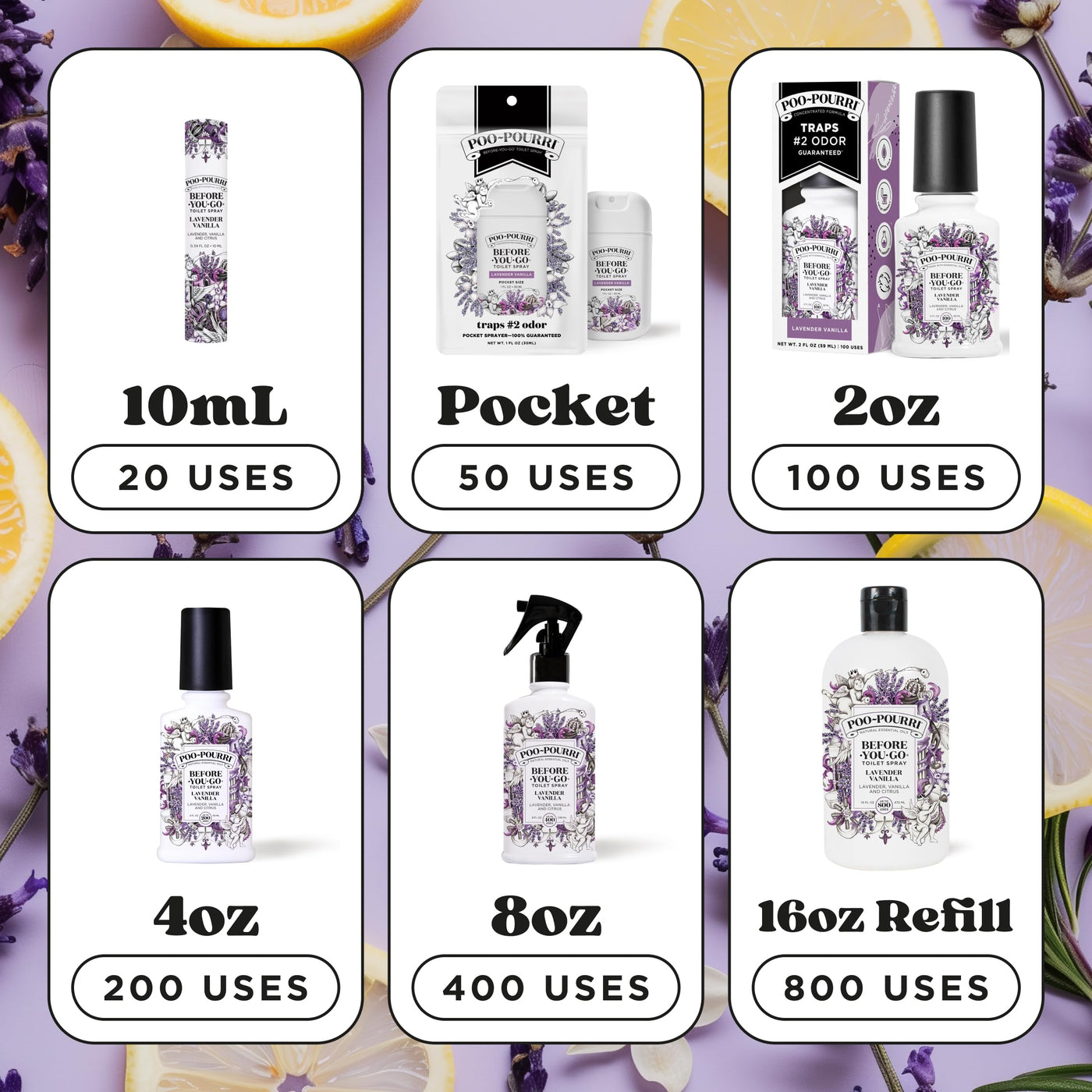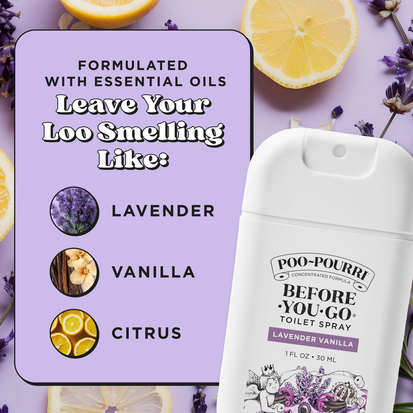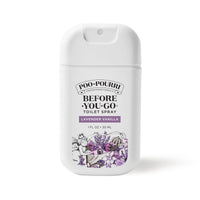 Details: Poo~Pourri Before-You-Go Toilet Spray, Lavender Vanilla Whether you're hitting the road, heading to the office, or jet-setting off to paradise, the Poo~Pourri Lavender Vanilla has your backside covered! This spray features signature lavender, vanilla and citrus scents:—packed in a 1 fl oz travel-sized bottle. Compact, but with big funk-fighting power, these plant-based sprays use Funk Lock Technology to trap odors beneath the water's surface, before they escape into the air. That means no awkward exits, and no lingering funk. The only thing you smell is a fresh burst of essential oils. Designed with travel in mind, each bottle is made of durable plastic, delivers up to 50 uses, and fits in bags, purses, or pockets. Equipped with a sleek new sprayer, the nozzle is easy to press, delivering a fine mist and an even spray pattern. Spritz before you go and leave any bathroom smelling like a luscious lavender and warm vanilla. Suitable for commuters, travelers, partygoers, or anyone on the go, this pocket toilet spray makes a thoughtful gift. So go ahead—use it before you go, wherever you go. Because everyone deserves to leave the bathroom smelling better than they found it.