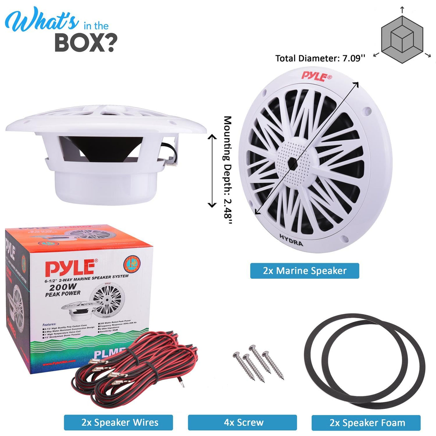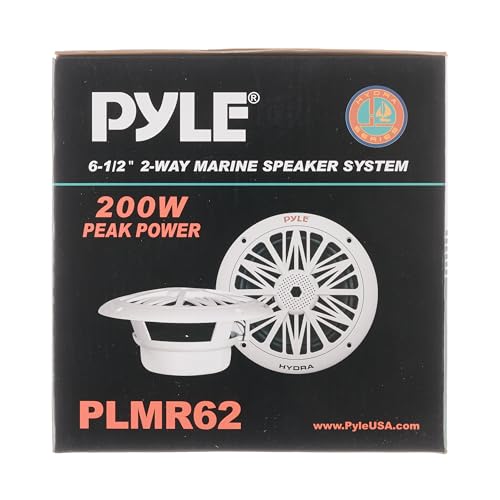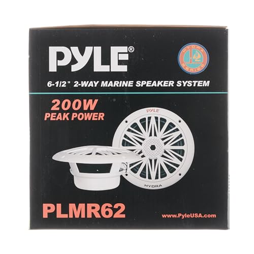 Details: Pyle's Hydra series speakers are water resistant and designed for use in your boat, on the dock, by the pool, or simply mounted outside. They're designed with rust-proof mesh covers for quality protection. The PLMR62 is a 200-watt, 6.5' two-way, full-range speaker suitable for marine use. These white speakers are equipped with a ½' neodymium dome tweeter for rich highs and a 1' aluminum voice coil for accurate sound reproduction. The molded ABS plastic basket keeps your sound distortion-free.