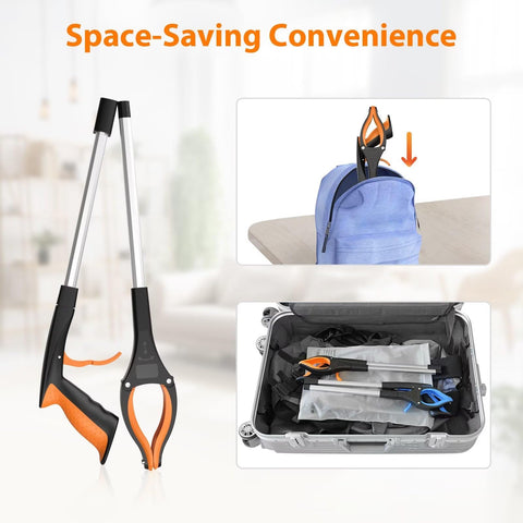 - Space Saving: With its folding feature, it can shrink down to a compact size of 17 inches. After folding, you can makes it a breeze to store in smaller spaces. This grabber reacher, available in bold orange and refreshing blue, make enabling safe retrieval of items placed high up and picking up dropped items without bending over.
