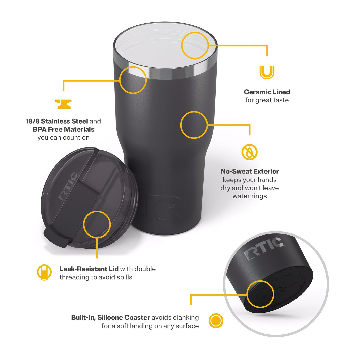 - DURABLE STAINLESS STEEL CONSTRUCTION: Crafted from 18/8 stainless steel and BPA-free materials, this tumbler cup is built to last; its durable design is RTIC tough, providing reliability and quality you can count on