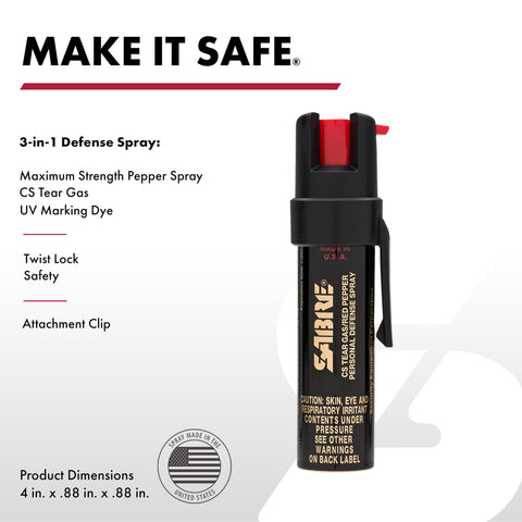Details: Stay safe while on the go. The SABRE Defense Spray with Attachment Clip provides maximum strength protection while being easy to carry and conceal. This advanced 3-in-1 spray is our most intense deterrent, containing SABRE’s maximum strength pepper spray, CS military tear gas to heighten the pepper spray burn, and UV marking dye to help the authorities identify a suspect after they’ve been sprayed. This spray contains 4X longer spray time for protection against multiple threats at a safe distance. With an industry-exclusive HPLC laboratory, only SABRE guarantees its maximum strength formulation in every canister to help give you peace of mind, certainty, reliability, and safety when you need it most. For protection on the go, simply slide the clip onto a belt or clip it to the inside of a pocket or purse. SABRE Defense Spray is made in the USA. Family owned and operated for 50 years, SABRE is the #1 brand trusted by consumers worldwide for pepper spray and is a leader in developing safety programs and safety videos to maximize end users’ safety. Empower yourself with extreme stopping power when you need it most.
