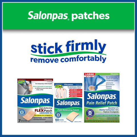 Details: Salonpas offers small pain-relieving patches that are 2.83 inches by 1.81 inches. One box contains 60 patches that can be worn for up to 8 hours. These comfortable, convenient, and effective topical pain patches have 3 powerful pain fighters that work at the site of pain.