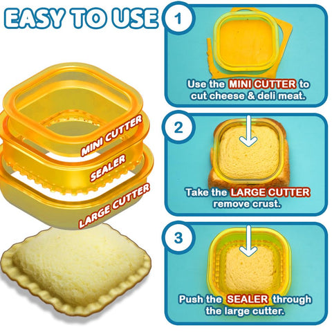 - 👶 PATENTED DESIGN: Tired of buying pre-made sandwiches from your grocery store? Use our patented cutter and sealer combo to create your own! The size is 3.5x3.5" so it's suitable for larger sized bread.