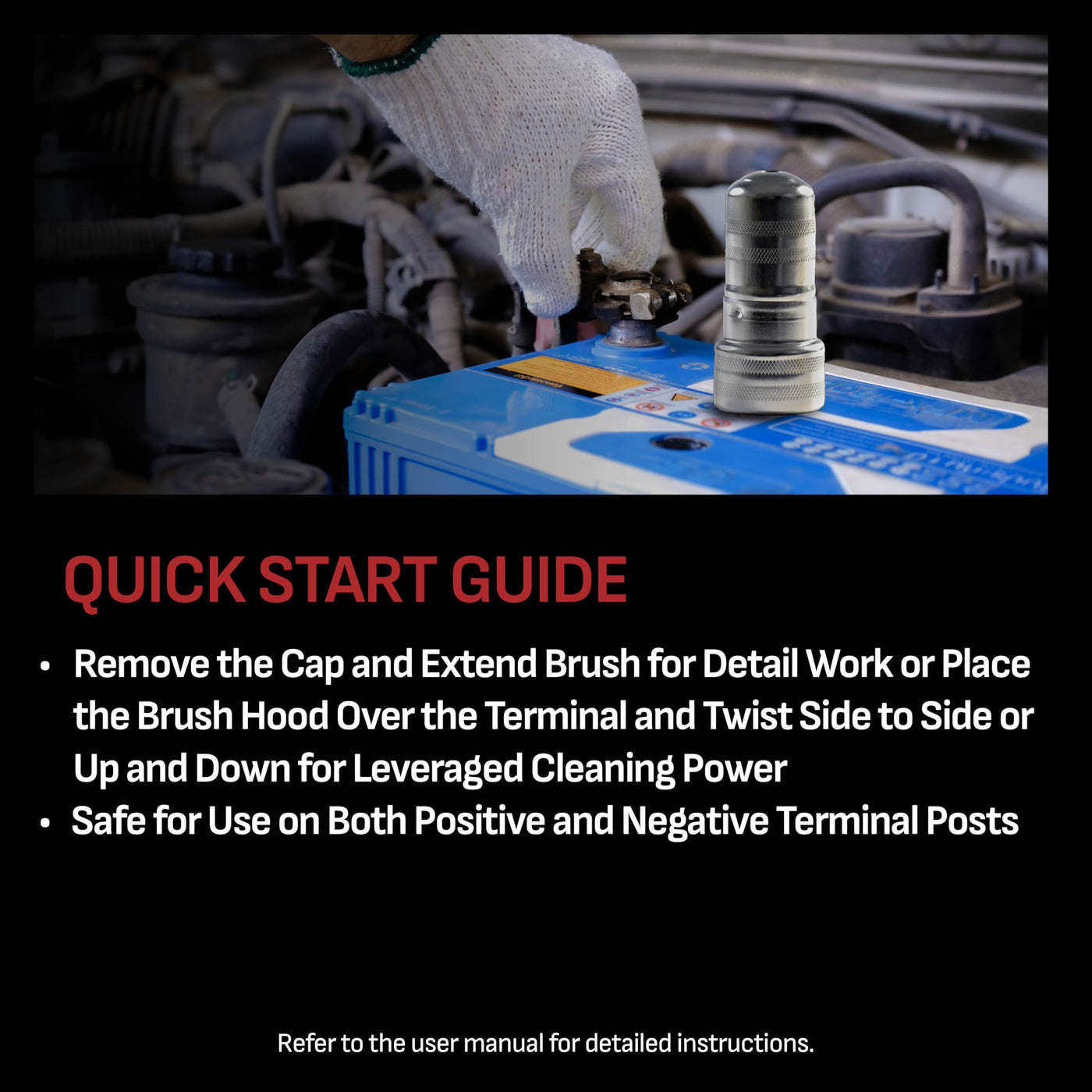 - Simple Operation - Remove cap of the cleaning brush and extend the brush head or press the brush hood over the terminal post for easy cleaning
