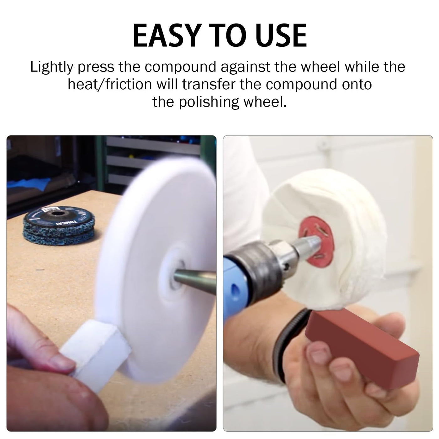 - 【How to Use】The jewelers rouge polishing compounds are designed to be applied on buffing wheels by simply turning a buffing wheel on a grinder/motor/drill and lightly press the compound against the wheel while the heat/friction will transfer the compound onto the polishing wheel.
