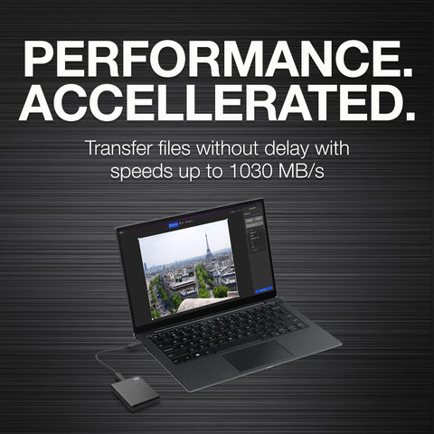 - High-speed, portable solid state drive perfect for streaming stored videos directly to laptop, scrolling seamlessly through photos, and backing up content on the go.