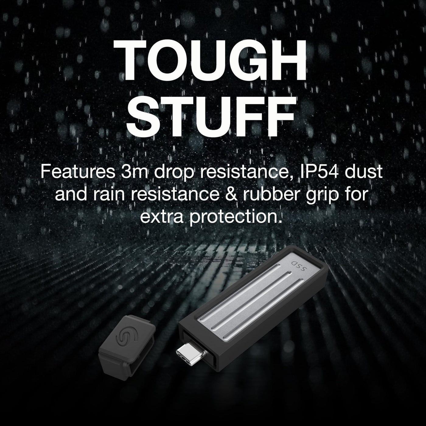 Details: Seamlessly store and work on files on-the-go with the sleek, cable-free Ultra Compact SSD. Conveniently free up space on your PC, phone, tablet or gaming device with transfer speeds of up to 1,000MB/s. Ideal for travel and adventure, it’s highly durable with 3-meter drop protection, IP54 dust and water resistance, and a rubber sleeve for extra grip.