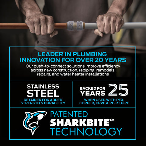 Details: Simplify your plumbing and home improvement projects with the SharkBite Max 1/2 inch push-to-connect brass ball valve. This shut-off valve connects PEX, copper, CPVC, PE-RT, or HDPE pipes without the need for soldering, glue, or tools, and installs easily in wet or tight spaces. Built with a reinforced stainless steel collar, SharkBite Max valves reduce insertion force by 50% while locking the internal cartridge securely in place. When it’s time for repairs or adjustments, the valve can be easily removed using a SharkBite Disconnect Clip or Disconnect Tongs (sold separately). These fittings are approved for use behind the wall and underground (wrapping required for burial), offering dependable performance in a wide range of residential and commercial systems. Made from durable DZR brass, this ball valve is rated for up to 200 degrees F and 400 PSI and inspected for functionality to 2,000 PSI burst pressure. Backed by a 25-year warranty.