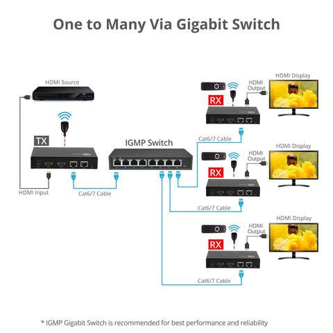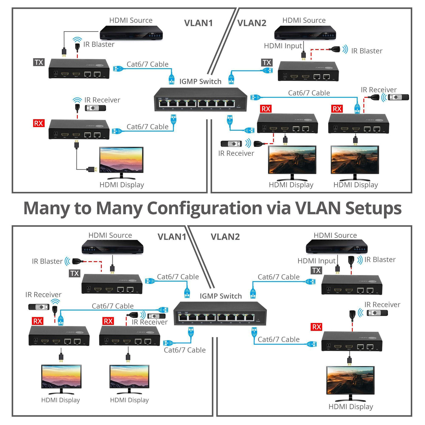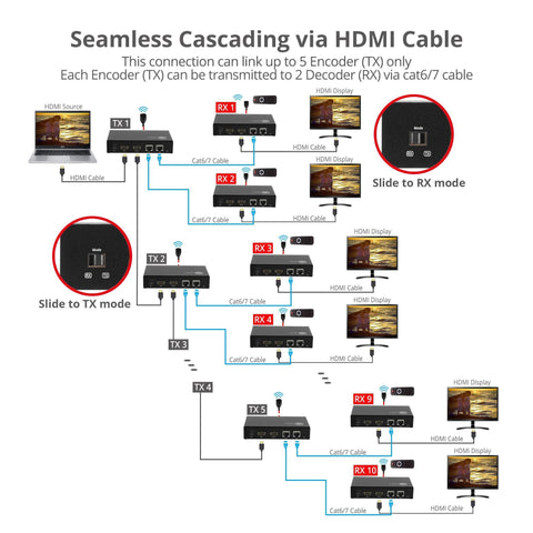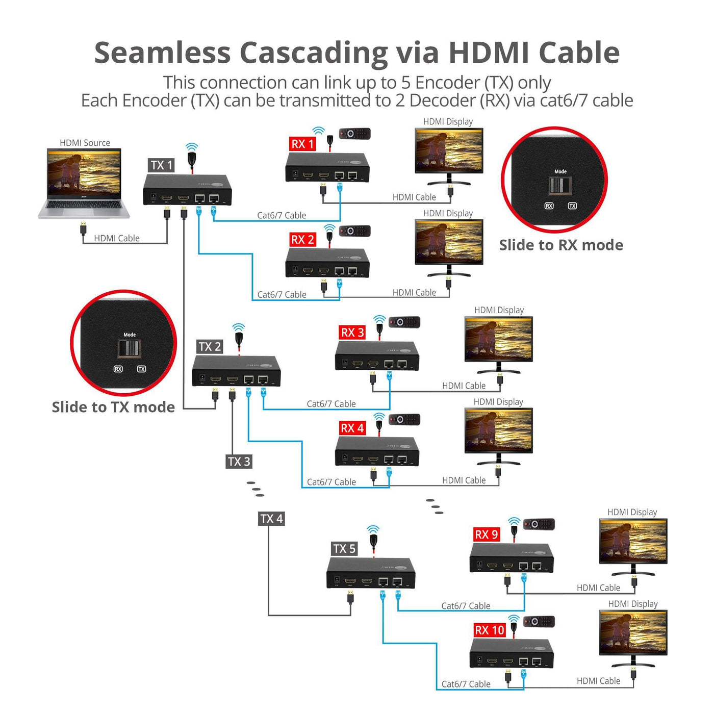 - Highly Scalable - Works as a scalable Encoder/Decoder (TX/RX) matrix over a dedicated IP network, enabling the extension of HDMI signals to multiple displays. It offers four connection modes: 1 to 1 (600ft), 1 to Many, Many to Many via VLAN and Cascading. Note: HDMI signal length of 600ft is only offered for 1 to 1 mode. Decreased to 328ft for all other modes. For Cascading TX to TX, we recommend max HDMI cable length of 33ft.