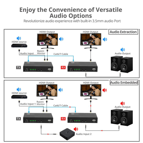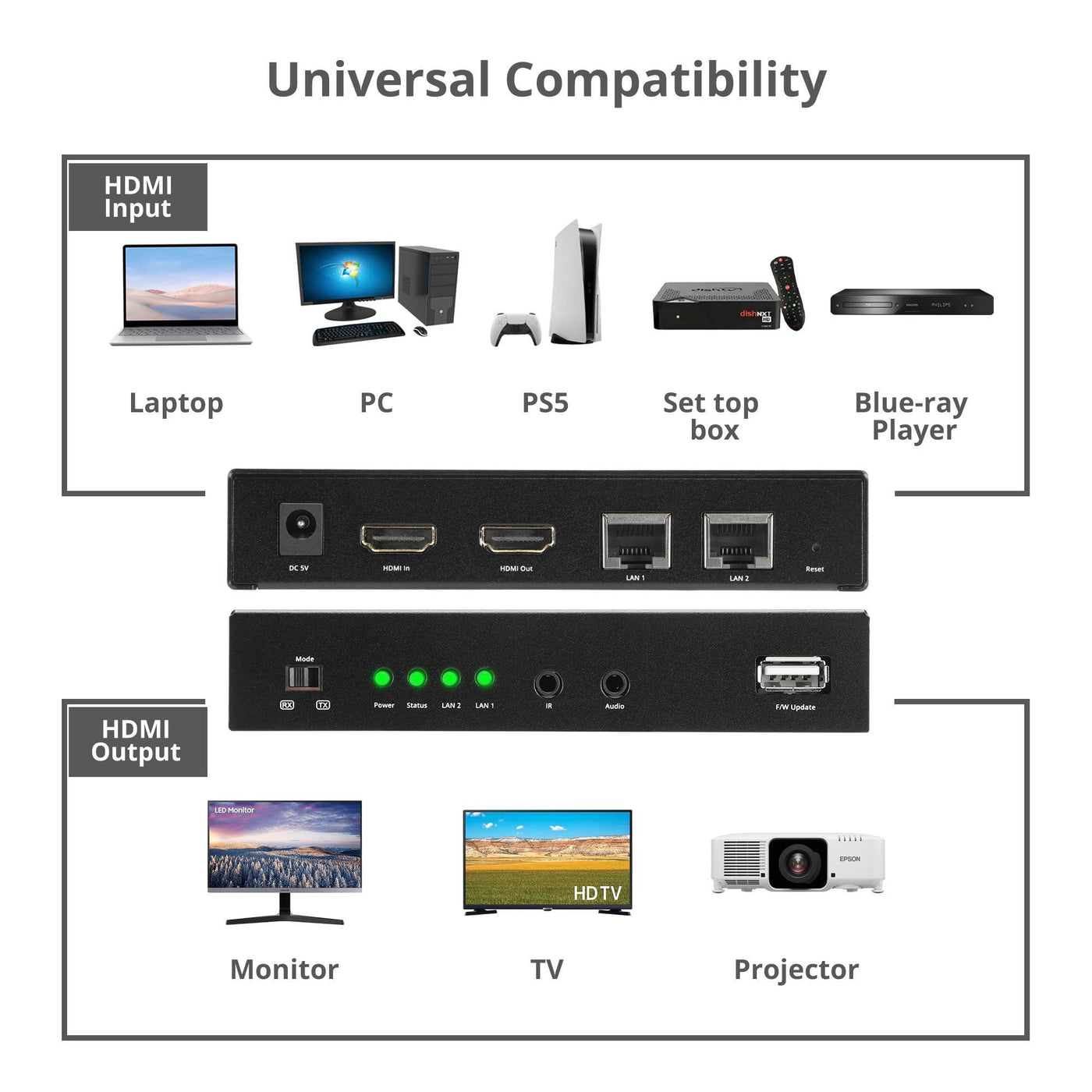 - Long Range HDMI Encoder & Decoder - This versatile HDMI over IP Encoder & Decoder Transceiver seamlessly integrates extender, splitter, and switcher functionalities into a single, powerful device, offering flexibility to configure as either an encoder or a decoder. Seamless transmission and expansion of HDMI audio/video signals to remote displays up to 600ft (180m) over Cat5e/6 network cables.