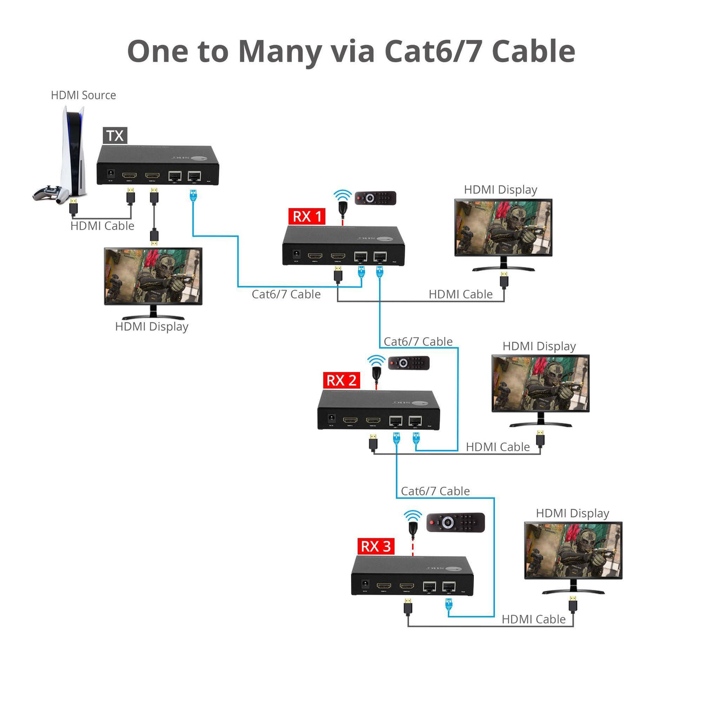 - IR Extension - Allows remote control of the HDMI Source device via the receiver and playback at the distant display. Supports IR signals in the 20-60KHz carrier frequency range. The IR emitter and receiver cables are included in box for convenient setup and operation.