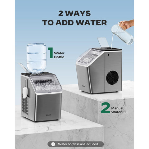 - Two Ways to Add Water: With a 3.0L water tank, the ice cube machine offers two ways to add water. You can opt for bottle filling by connecting a water bottle to the ice maker on top or manually add water directly into the reservoir. NOTE: Water bottle is not included