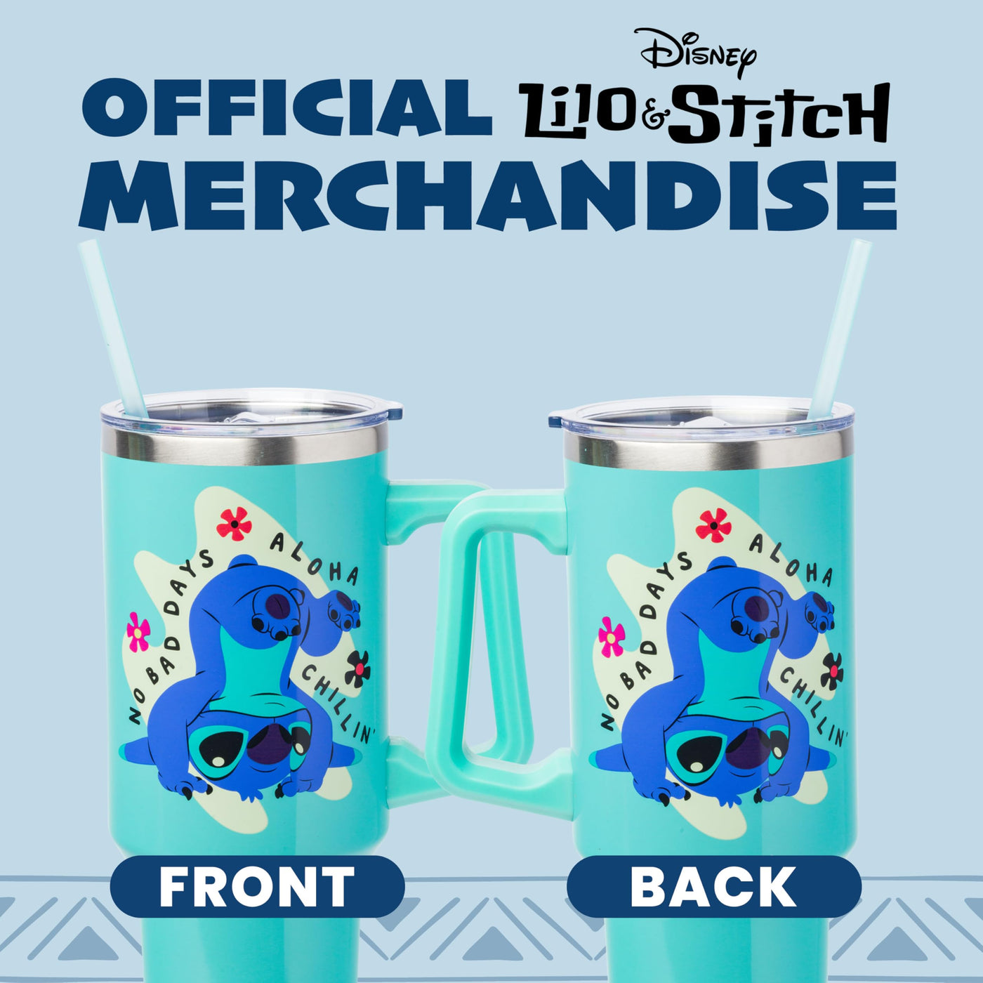 - LILO AND STITCH: Join Stitch with this double-walled stainless steel travel tumbler that holds 40oz. Designed in a bright blue background, it features Stitch doing a handstand with the text “Aloha” ‘No Bad Days” and “Chillin’.” It includes a secure sliding lid and straw to stay hydrated on the go. It can even fit in your standard-size cup holder!
