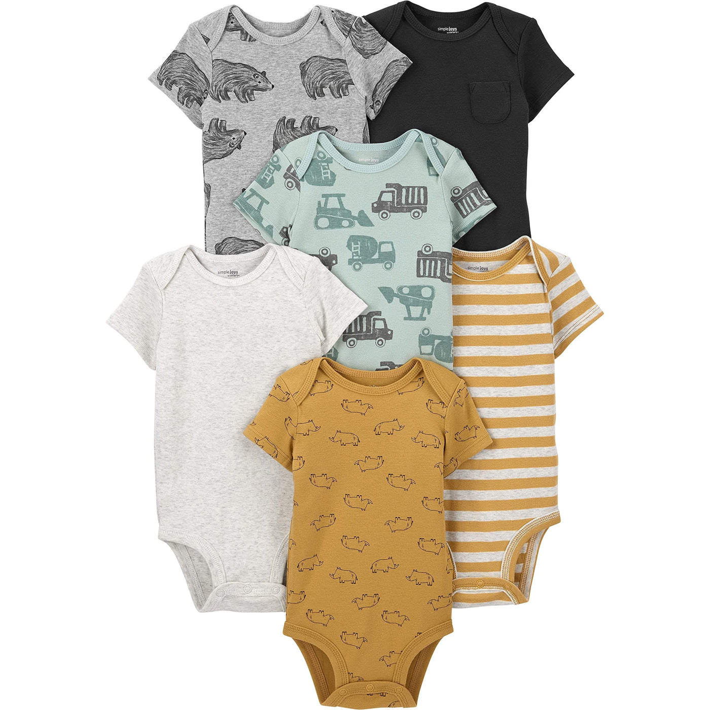 Simplify dressing your baby boy with this 6-pack of short-sleeve bodysuits from Simple Joys by Carter's. Each bodysuit features expandable shoulders that make it easy to slip over your baby’s head, while the strong, nickel-free snaps ensure quick and hassle-free diaper changes. Made from 100% soft and breathable cotton, these bodysuits are gentle on your baby's skin and perfect for everyday wear. The tagless design eliminates irritation, keeping your baby comfortable all day long. With OEKO-TEX Standard 100 certification, you can trust that these bodysuits are safe and free from harmful substances. Available in a convenient 6-pack, these bodysuits provide exceptional value and are designed to mix and match easily with any outfit. Simple Joys by Carter's delivers high-quality, stylish clothing at affordable prices, making this 6-pack a smart choice for parents looking for both quality and value.