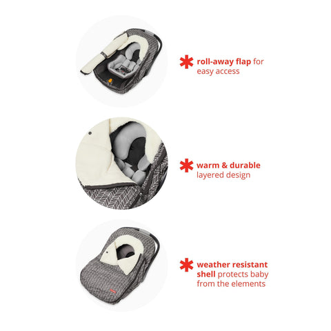 Baby car seat covers are the perfect accessory for cold weather travel with your little one. With elastic edges to secure around any car seat, our cozy cover frames baby s head in plush fleece. Keep the collar closed to block out cold wind, or flip it open and snap it to the outer layer for instant temperature control. The roll-away front flap offers easy access to baby and zips off for full access.