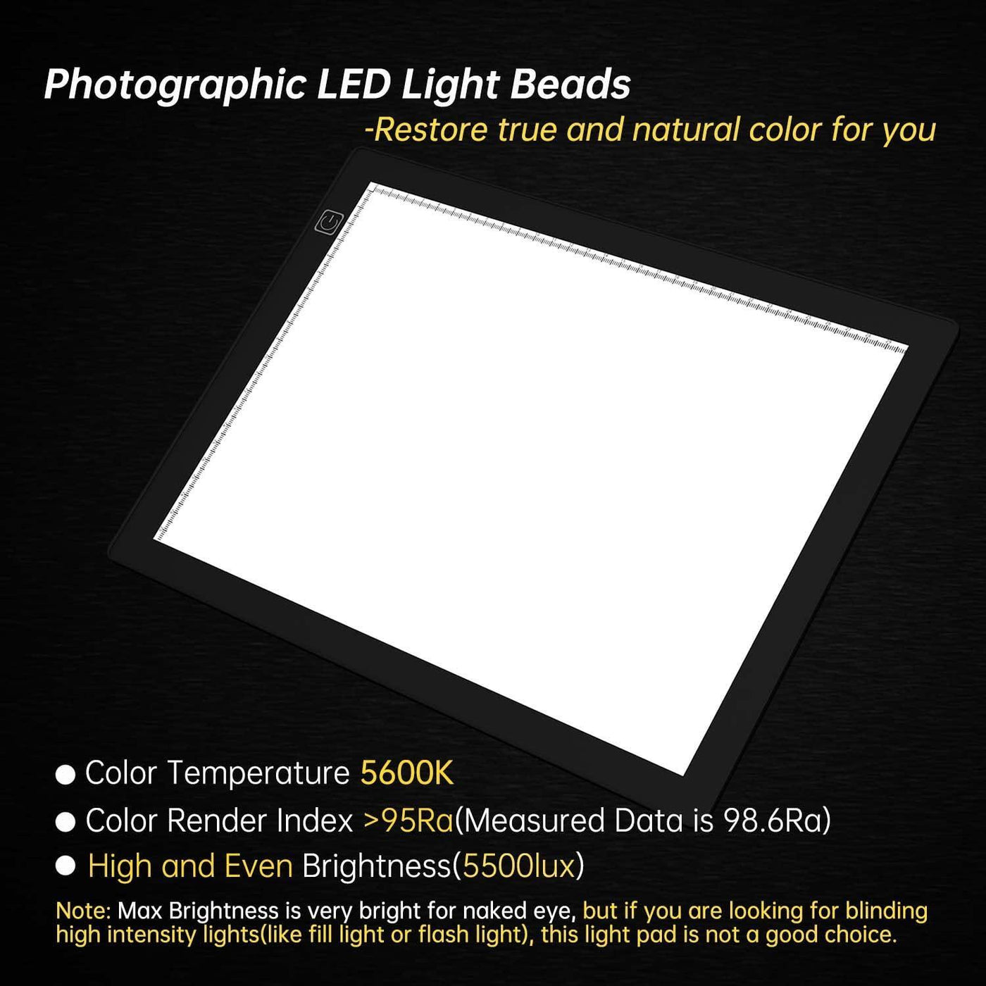 - Super Bright, Even and Flicker-Free Illumination: This light box adopts double-sided LED light design(brightest A4 size light pad you can find in the market), providing brighter and more even light than other one-side light box. The Flicker-Free LED helps relieve visual fatigue in long time usage. Max brightness: 5490Lux. LED Life Span: 50000 hours.
