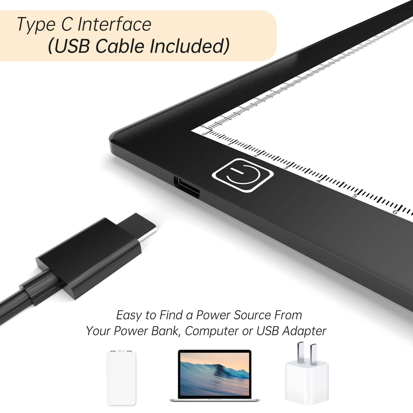 - Type-C USB Interface: This light pad comes with Type-C USB cable. With USB Interface, you can easily find a power source anywhere, the power bank, your computer or with USB adapter