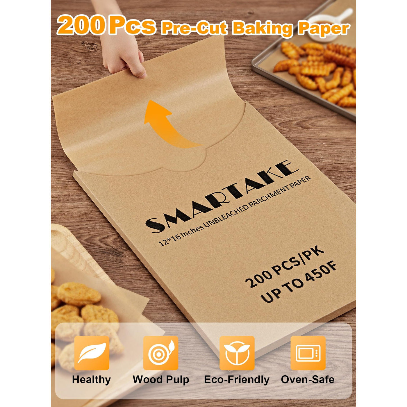 SMARTAKE 200 Pcs Parchment Paper Baking Sheets, 12x16 Inches Non-Stick Precut Baking Parchment, for Baking Grilling Steaming Bread Cup Cake Cookie and More (Unbleached)