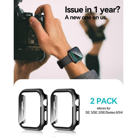 - [Package Include]: 2 pack black Screen Protector Case for apple watch SE 3 (2025)/SE 2/SE/series 6/5/ 4 44mm, 1 pack of small soft cloth. This case is not waterproof. It is recommended to remove it before swimming or exercising. If moisture gets inside, just take off the case and dry it with a soft cloth.
