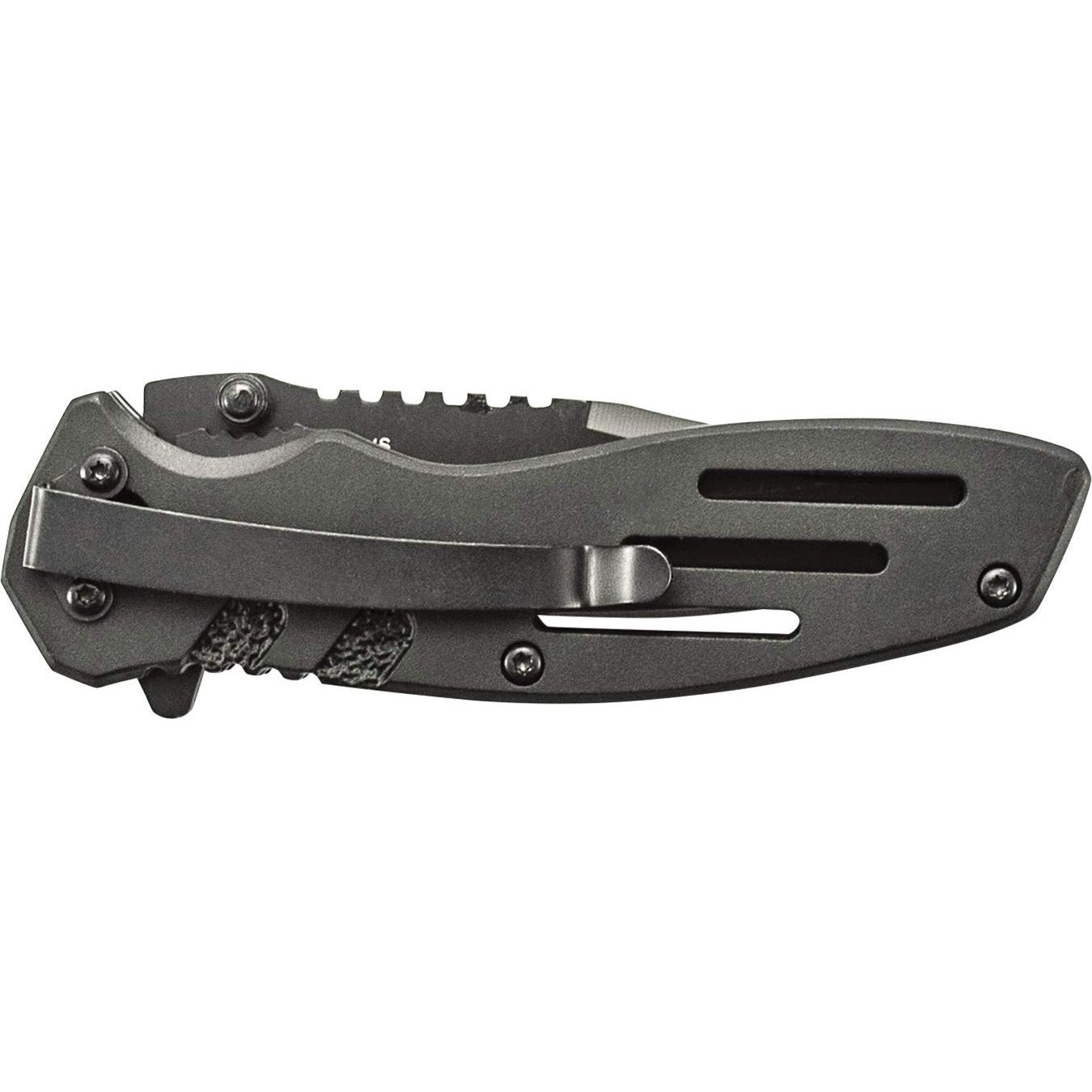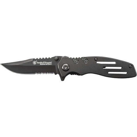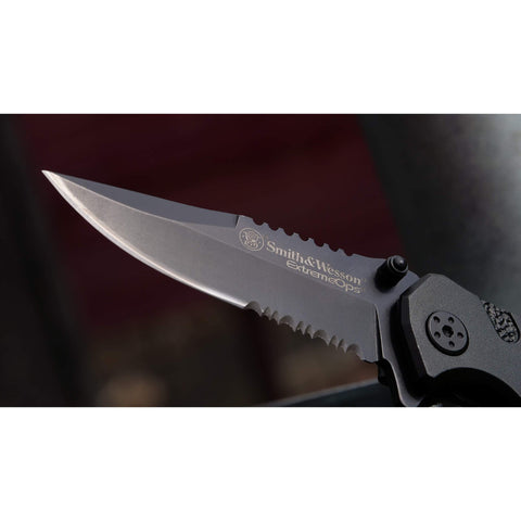 Details: Smith & Wesson Extreme Ops Liner Lock Folding Knife is made with a black high carbon stainless-steel partially serrated clip point blade. This knife has ambidextrous thumb knobs, jimping, and an index flipper. The black aluminum handle comes with jimping and a pocket clip.