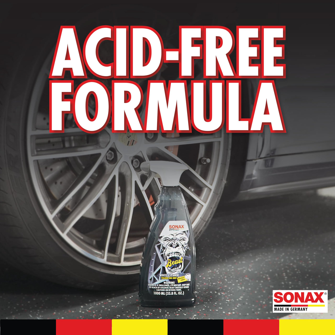 Details: Sonax's Beast Wheel Cleaner is acid-free, and this color-changing wheel cleaner is safe for all wheels. It makes cleaning car wheels easier and faster. Simply spray onto cool, dry wheels, let it sit for 2-4 minutes, and rinse with a pressure washer or strong water jet from a hose. A quick way to go from dirty wheels to clean in minutes. Economical 1000-milliliter bottle