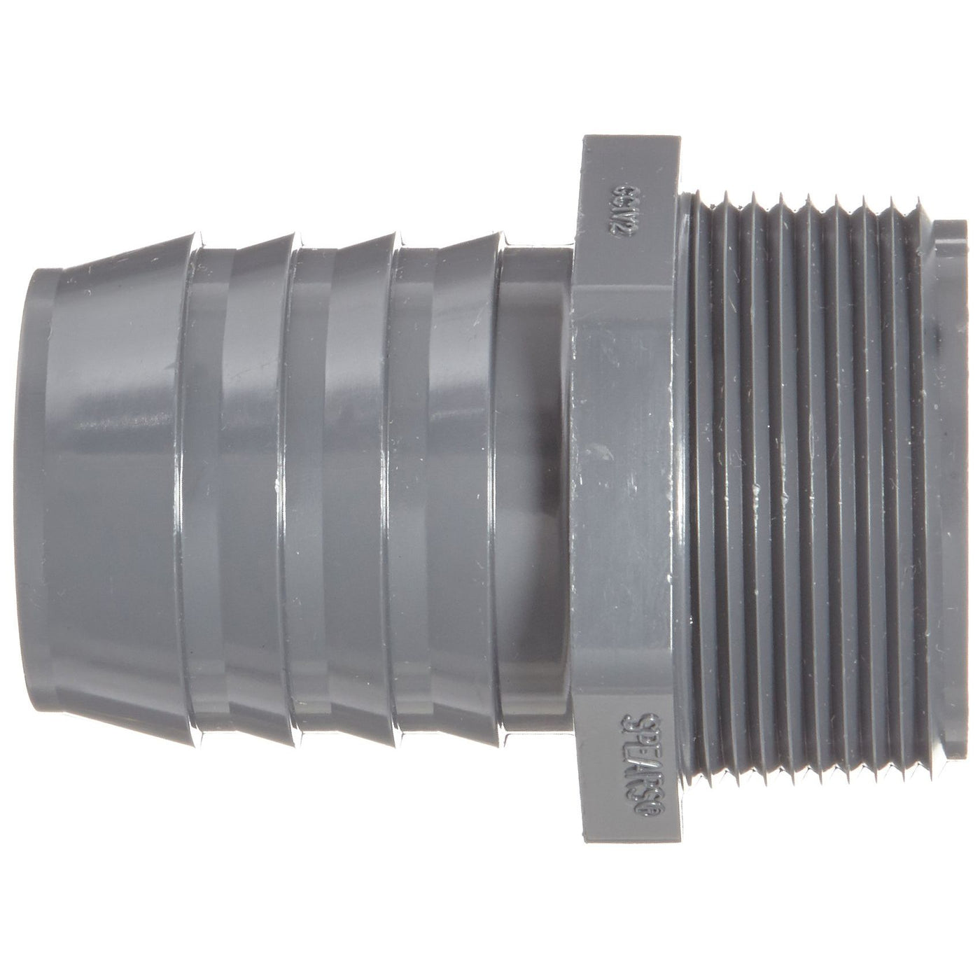 Details: This Spears 1436 series tube fitting is made of gray polyvinyl chloride (PVC) plastic and has a male National Pipe Thread (NPT) thread on one end and a barbed insert on the other for connection to ASTM International schedule 40 polyethylene (PE) pipe in a straight run. The adapter's barbed fitting creates a tight seal on flexible PE pipe when used with a hose clamp (sold separately). The PVC fitting has a maximum working pressure that is dependent on the PE pipe it is used with, a maximum working temperature of 140 degrees F, and resists reactions with acids, gasoline, alcohol, and hydrocarbons. This male barb tube fitting meets ASTM D2609 standards for plastic insert fittings for use with PE pipe, ASTM schedule 40 standards for wall thickness, and is NSF International 61 certified for use with potable water.